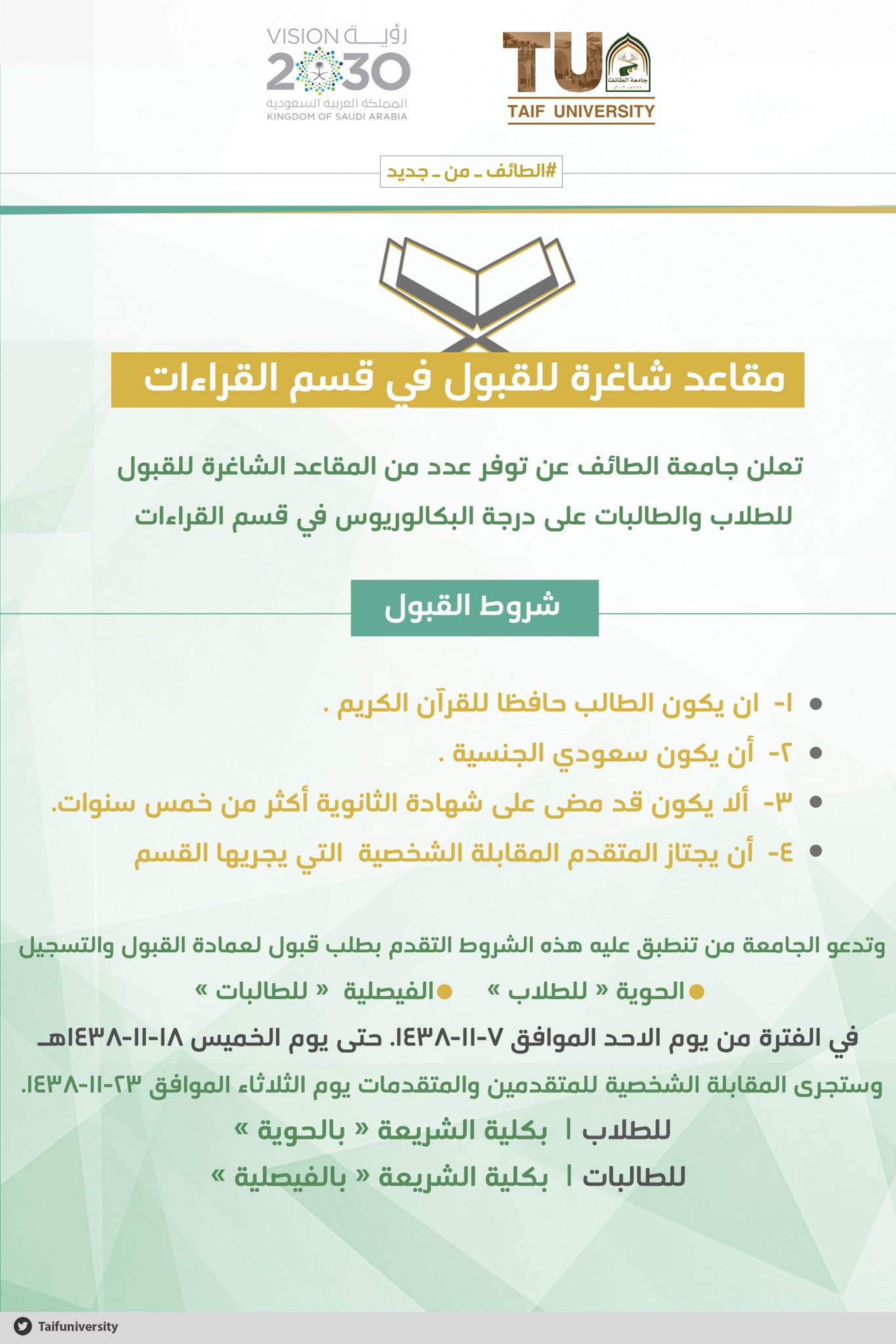 جامعة الطائف Ar Twitter تعلن جامعة الطائف عن توفر عدد من المقاعد الشاغرة للقبول للطلاب والطالبات على درجة البكالوريوس في قسم القراءات الطائف من جديد Https T Co Xneatvyub3