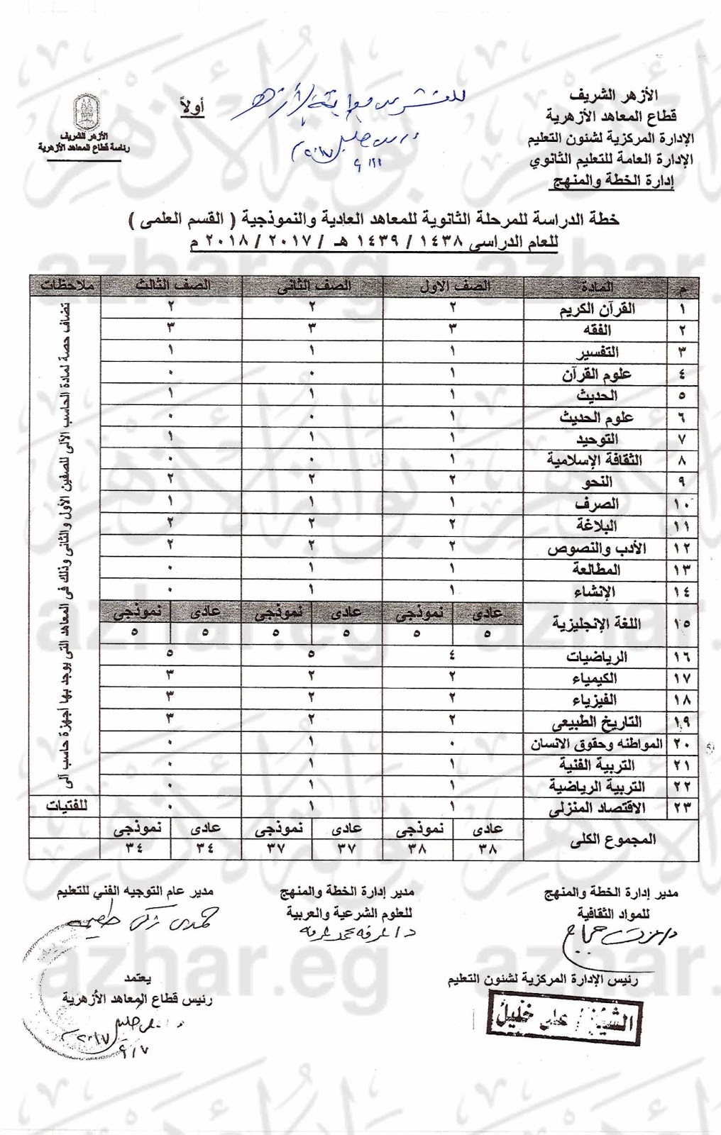 توزيع مناهج الشرعي والعربي للثالث الثانوي علمي الازهري 2018